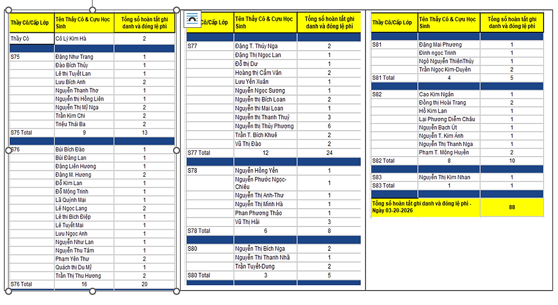 Dưới đây là danh sách tên của các cựu học sinh và thân hữu đã hoàn tất ghi danh theo từng cấp lớp. Mọi thắc mắc xin vui lòng liên lạc với Ban Tổ Chức qua địa chỉ email: sna2026btc@gmail.com.