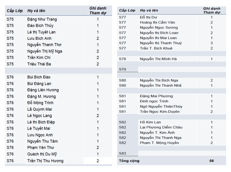 Trần Kim Chi, S75Dưới đây là danh sách tên của các cựu học sinh và thân hữu đã hoàn tất ghi danh theo từng cấp lớp. Mọi thắc mắc xin vui lòng liên lạc với Ban Tổ Chức qua địa chỉ email: sna2026btc@gmail.com.